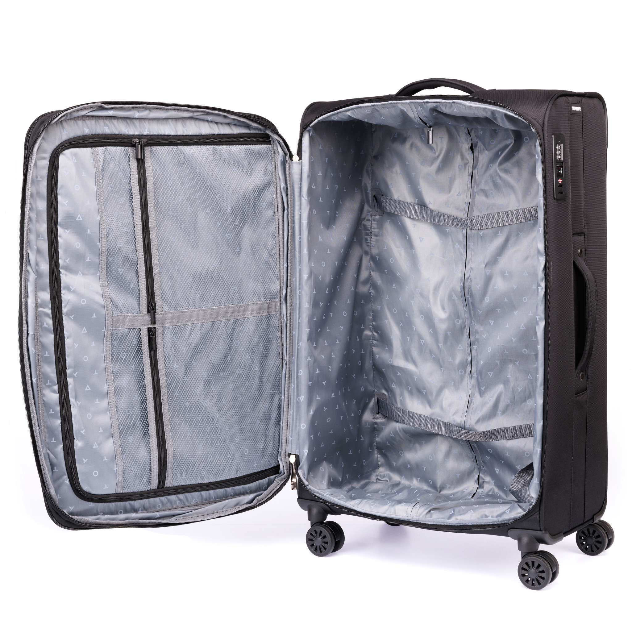 Чемодан полностью раскрывается на 2 отделения, с перегородкой на молнии и ремнями для надежной фиксации вещей на месте.