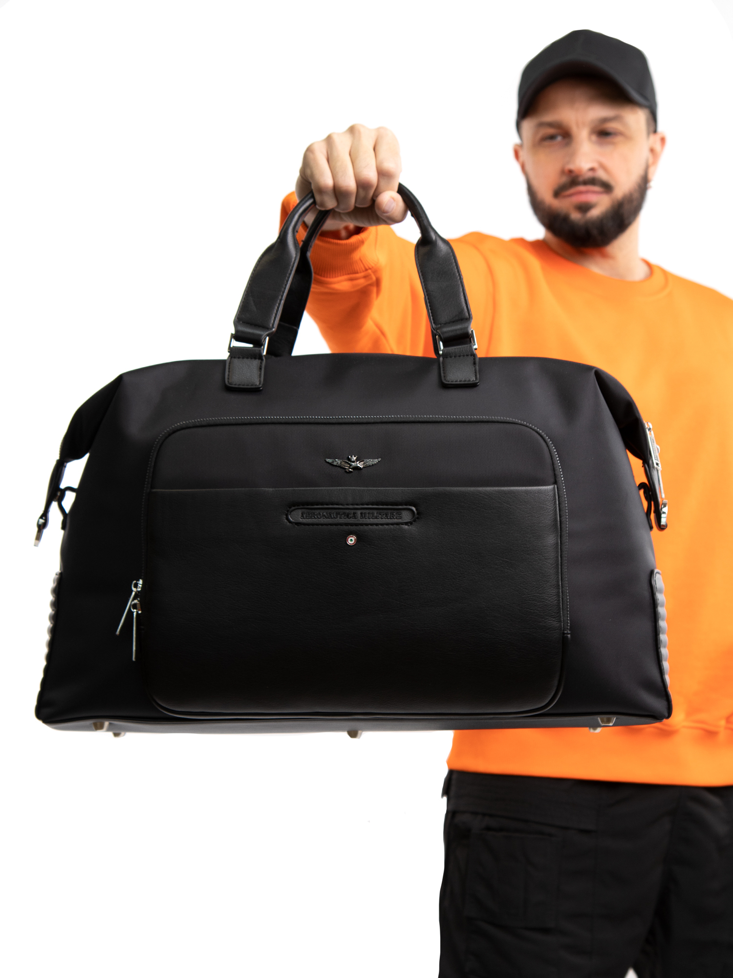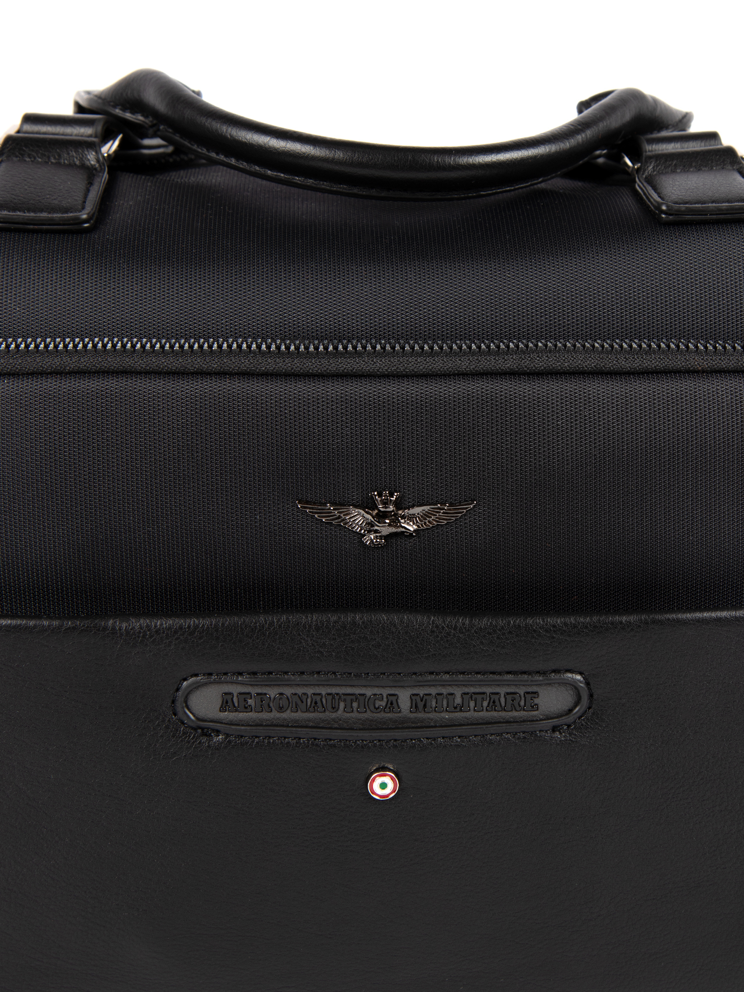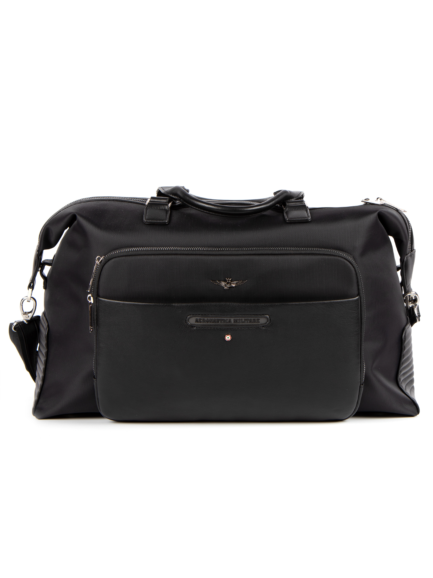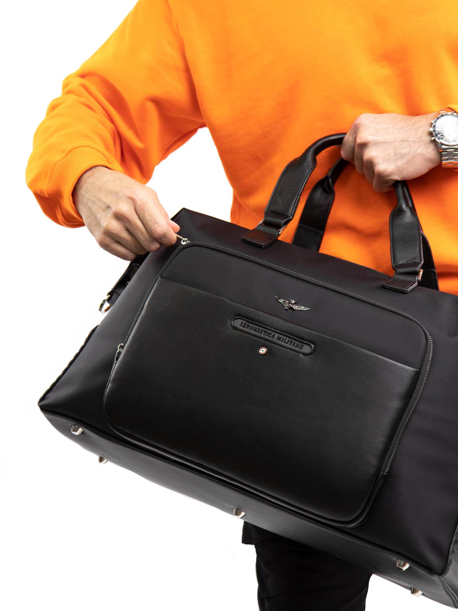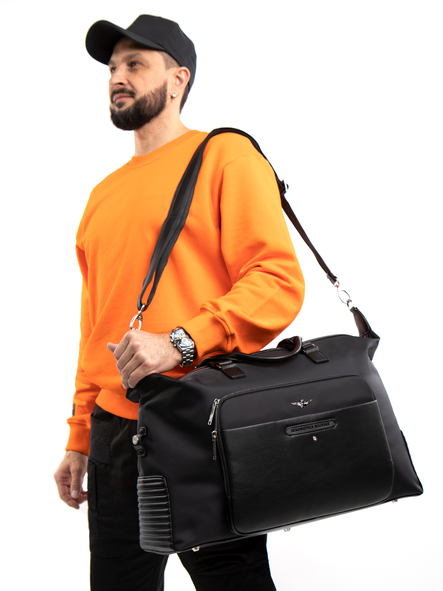 Сумка для путешествия линейки SKY с плечевым ремешком, характеризуется сочетанием двух материалов, искусственной кожи и технической ткани (полиэстер), а также передний карман для смартфона или ключей, который включает в себя логотип Aeronautica Miliare.