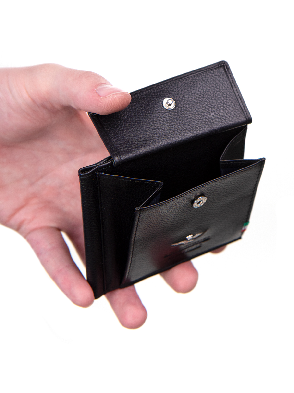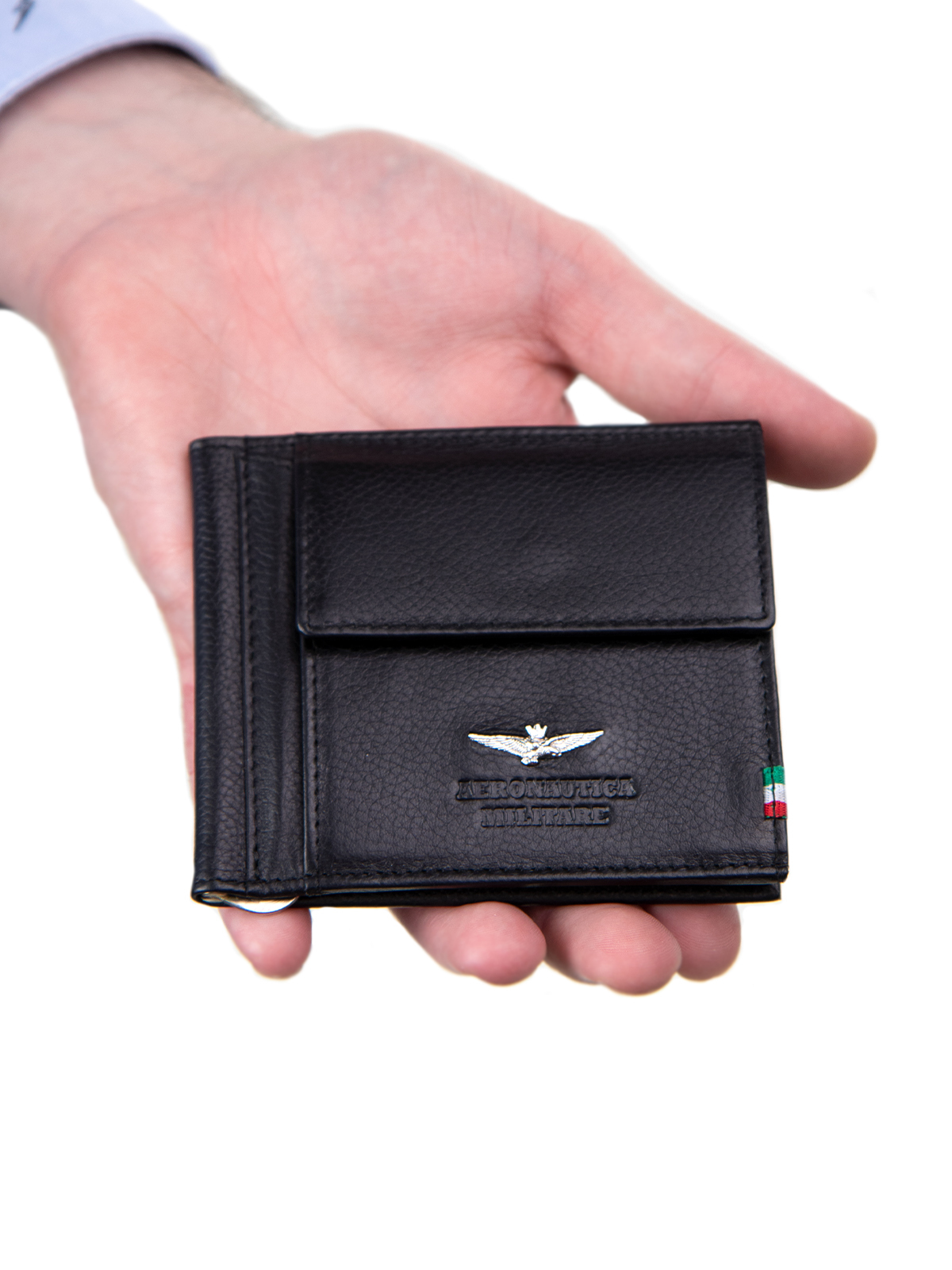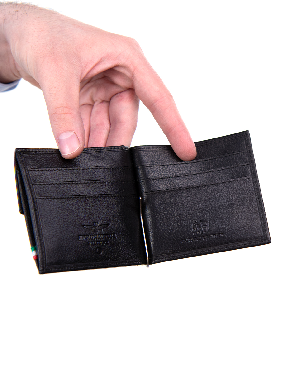 Зажим для купюр Aeronautica Militare FLAG Итальянского бренда представлен в классических цветах. Компактный зажим для купюр содержит 3 отделений для пластиковых карт и евровизиток, отделение с зажимом для купюр, отделение на кнопки для монет. Изготовлен из натуральной кожи.