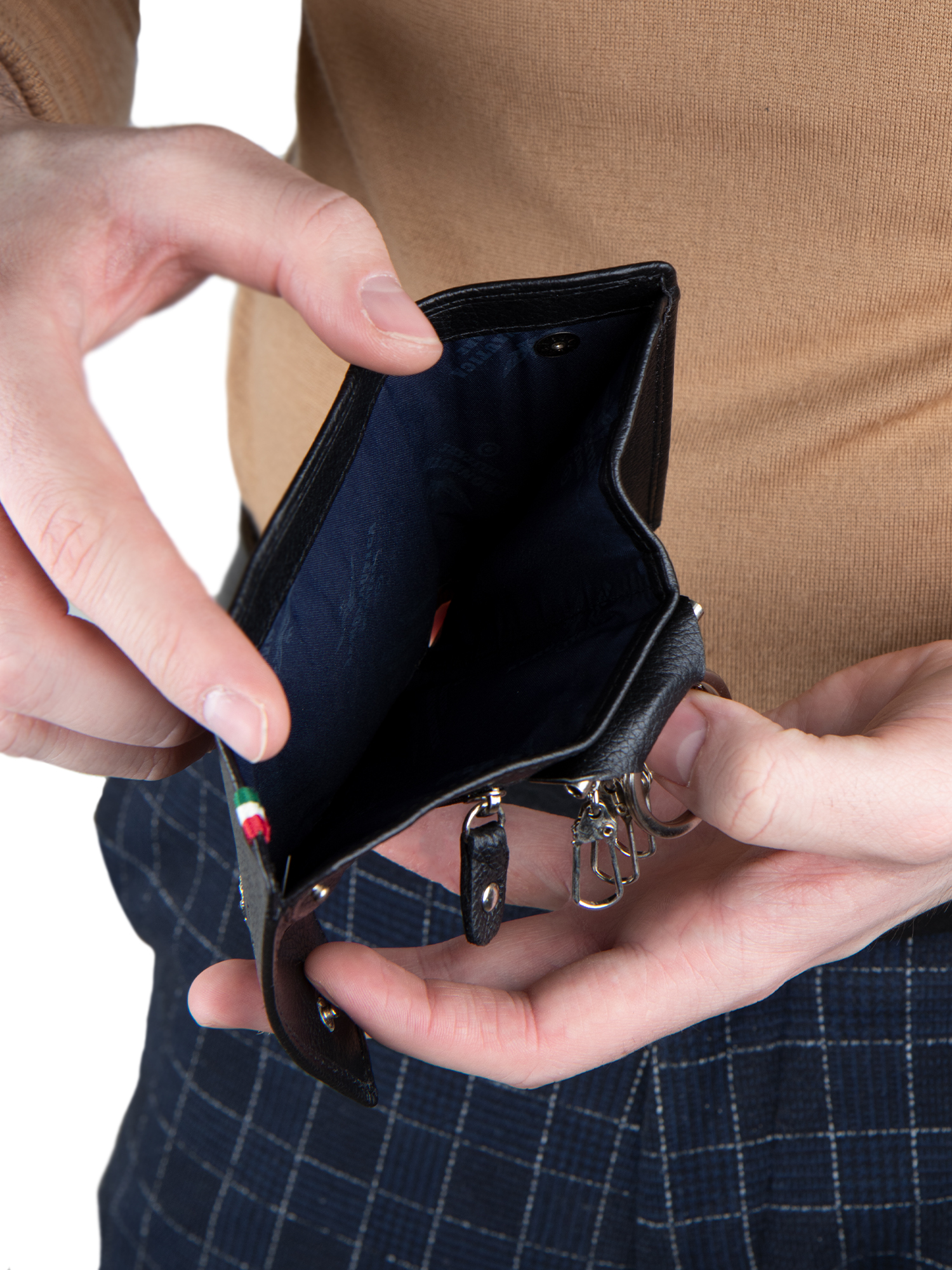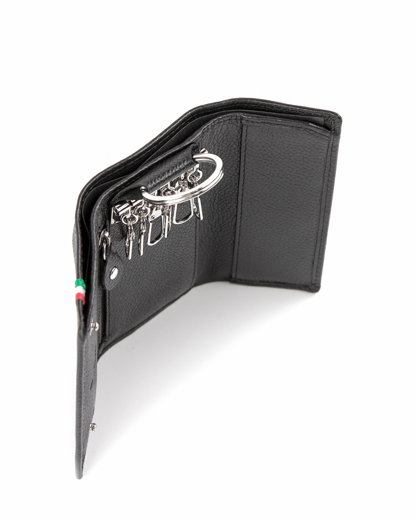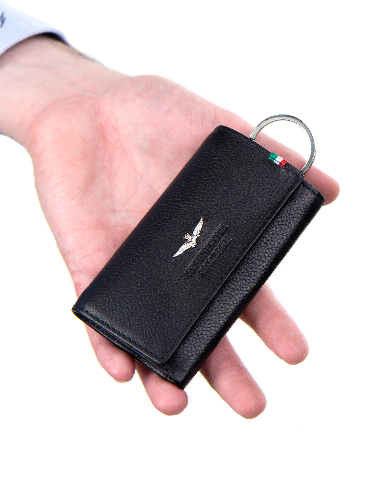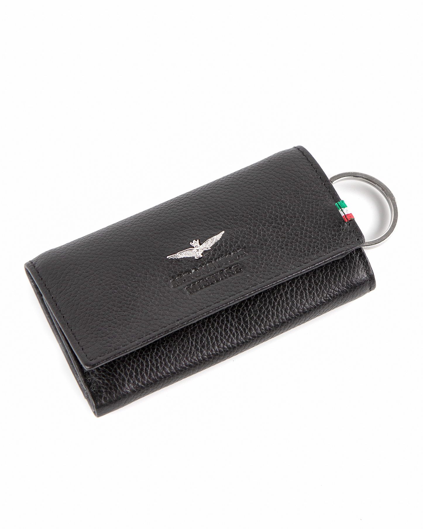 Кожаная ключница Aeronautica Militare FLAG итальянского бренда представлена в классических цветах. Компактная ключница содержит 3 отделения, это для Ваших ключей, имеет внутреннее отделение для монет которое застегивается на молнию, а также можно ключницу использовать как небольшое портмоне. Изготовлена ключница из натуральной кожи высшего сорта.