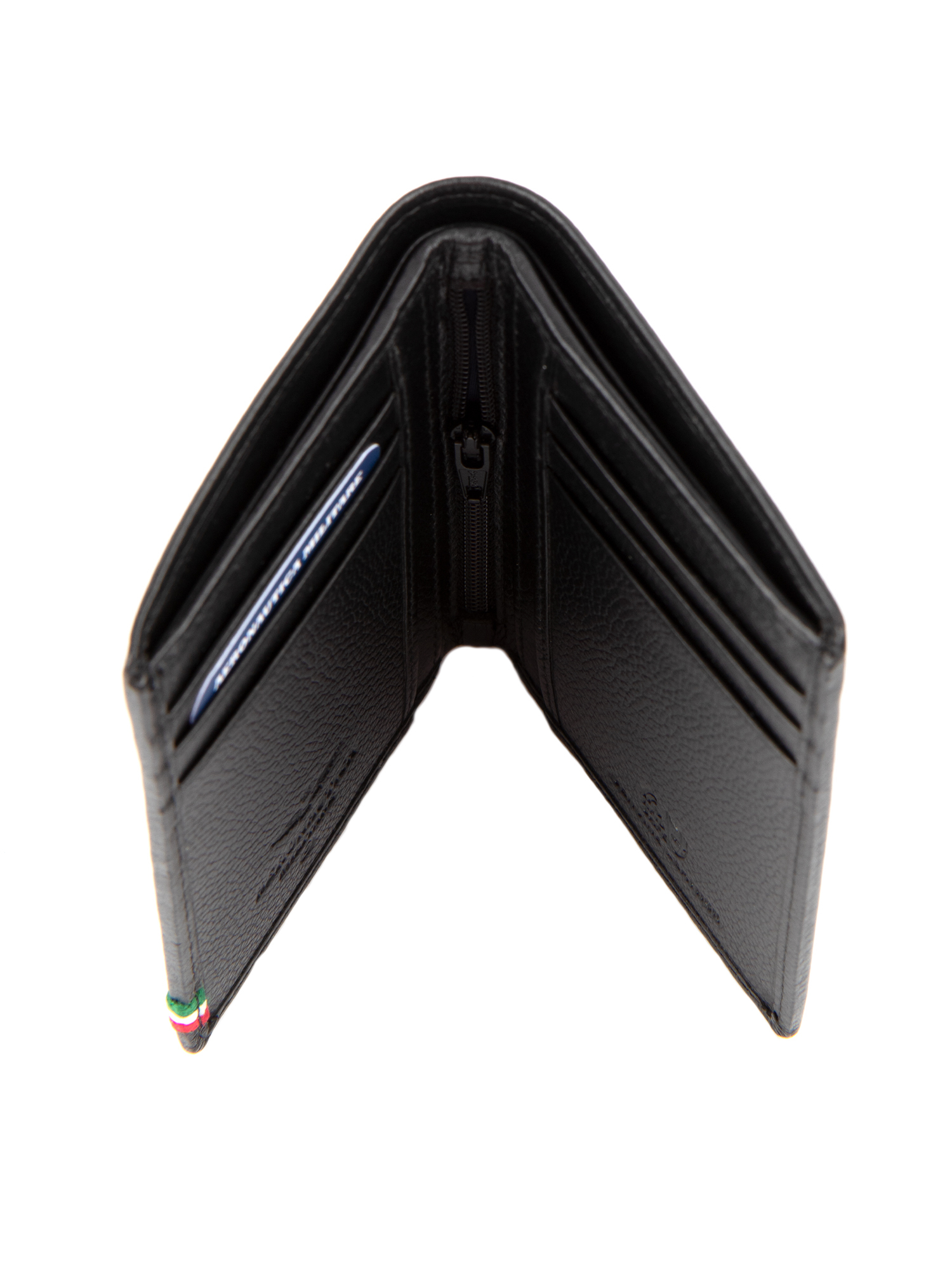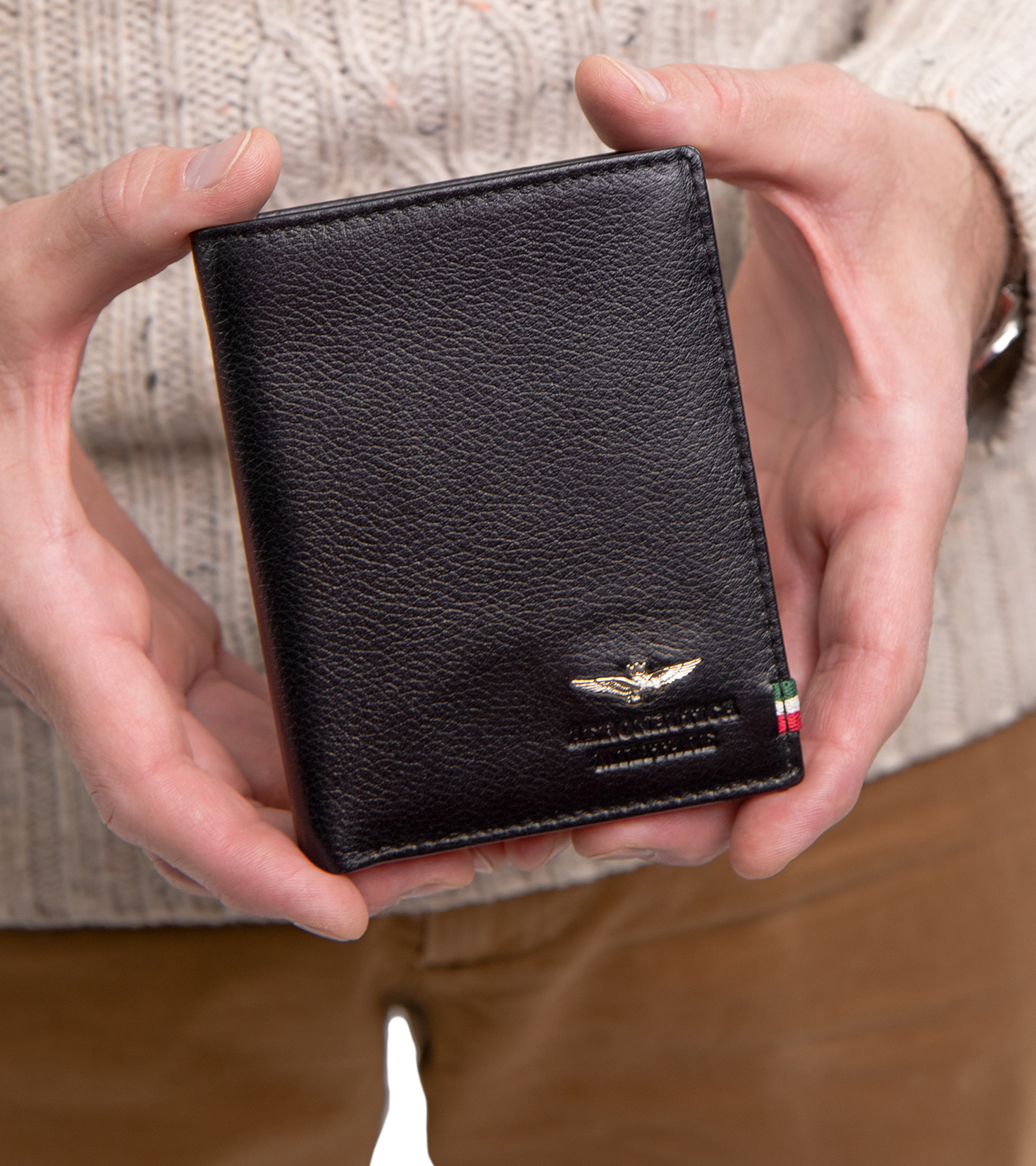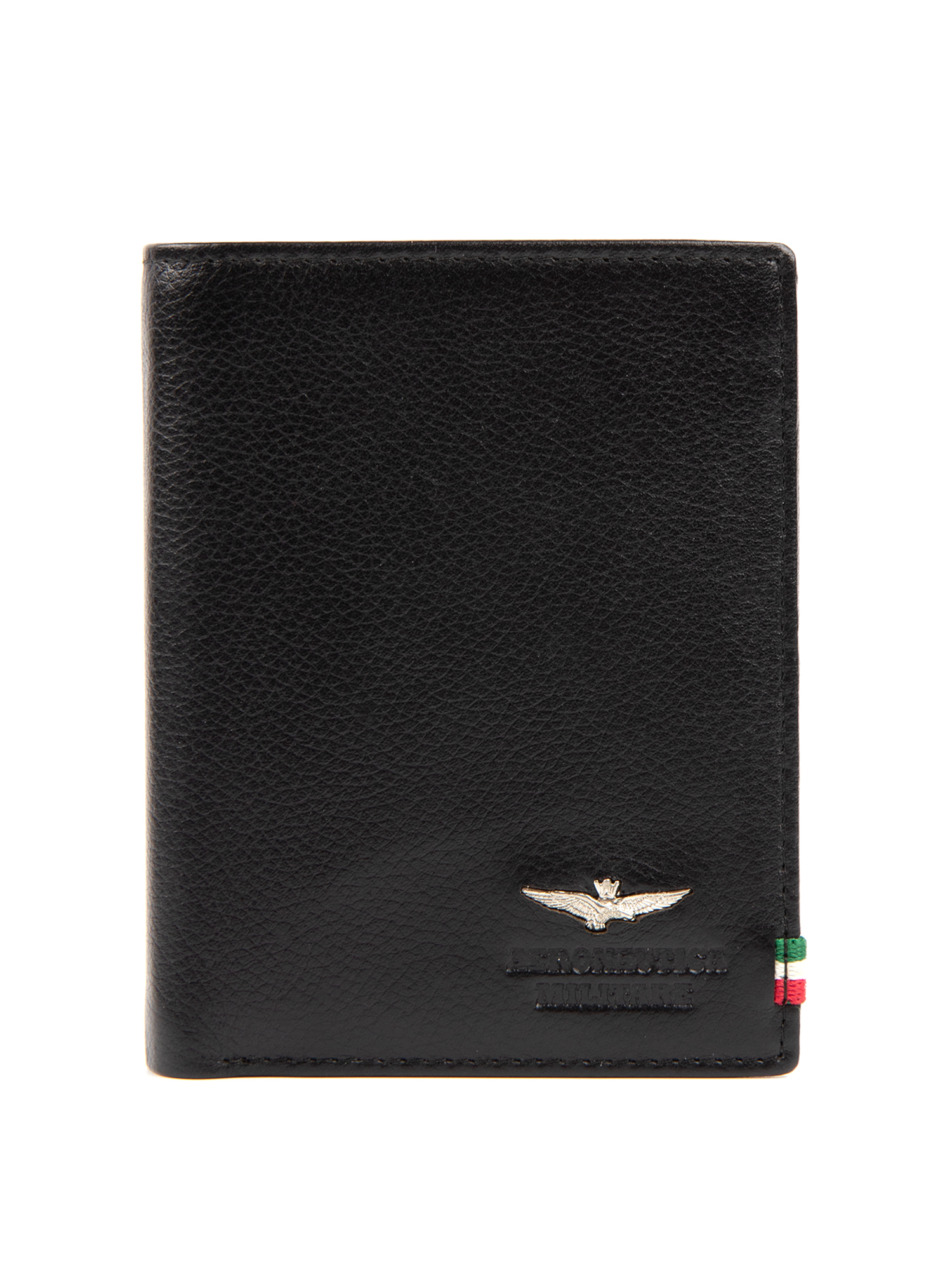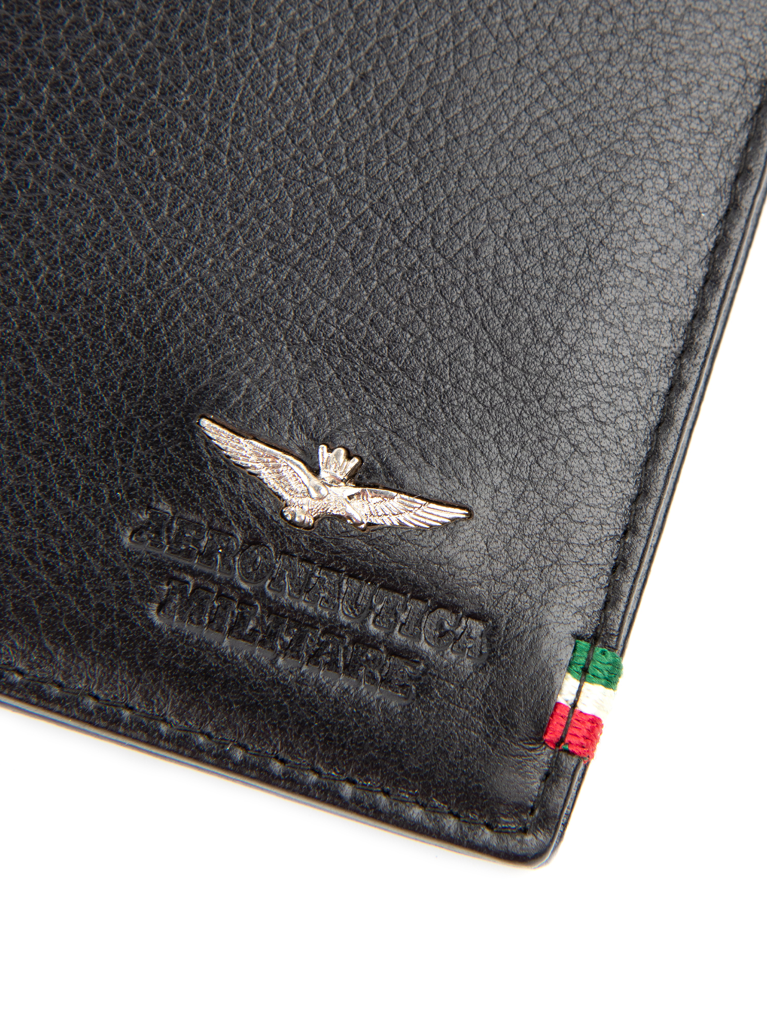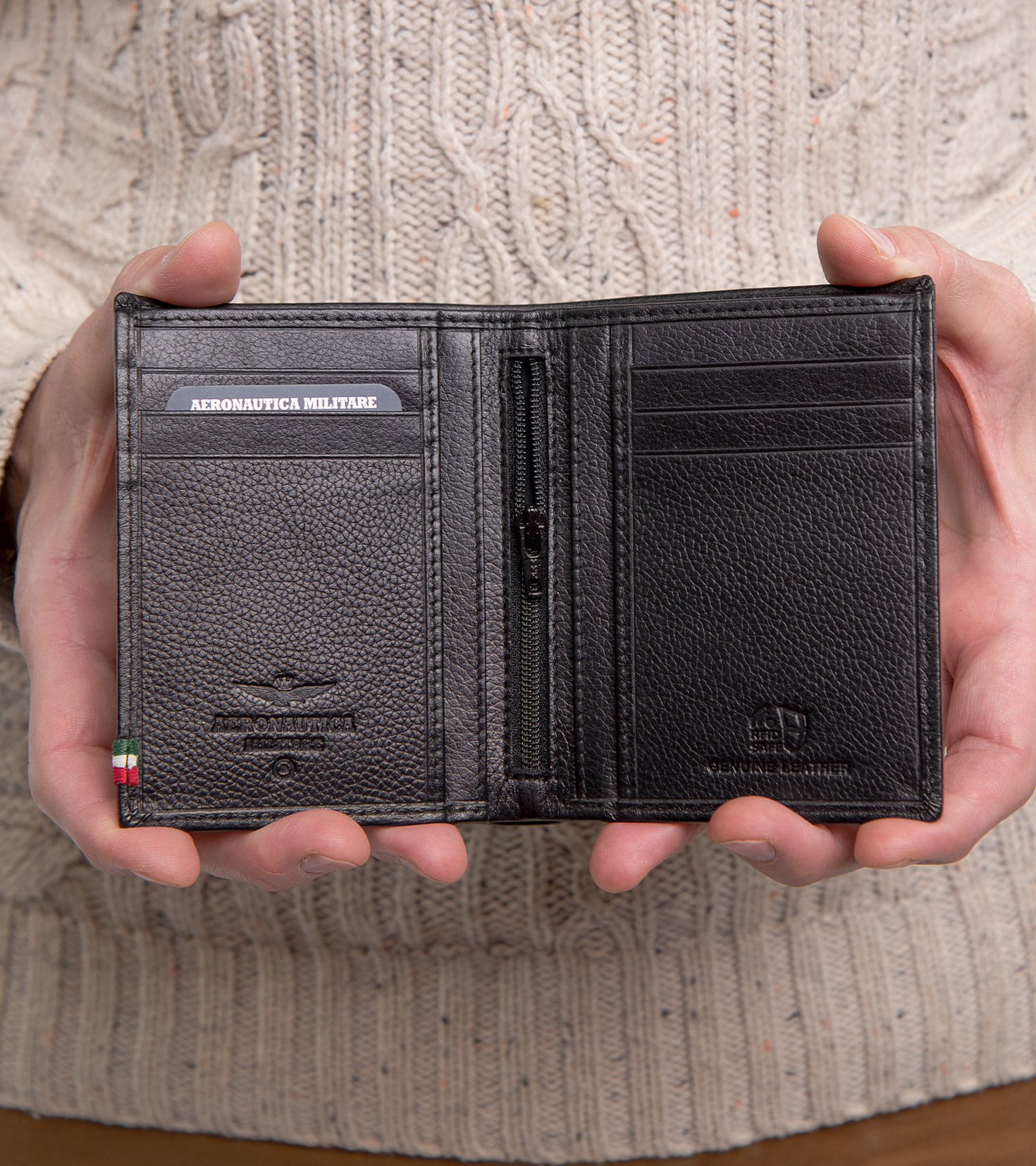 Кожаный кошелек Aeronautica Militare Eagle Итальянского бренда представлен в классическом черном цвете. Компактное портмоне содержит 7 отделений для пластиковых карт и евровизиток, имеет внутреннее отделение для монет, которое застегивается на кнопку, и два отделения для купюр. Изготовлен из натуральной кожи.