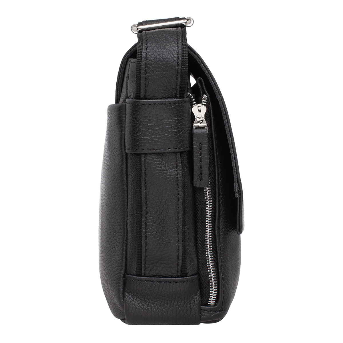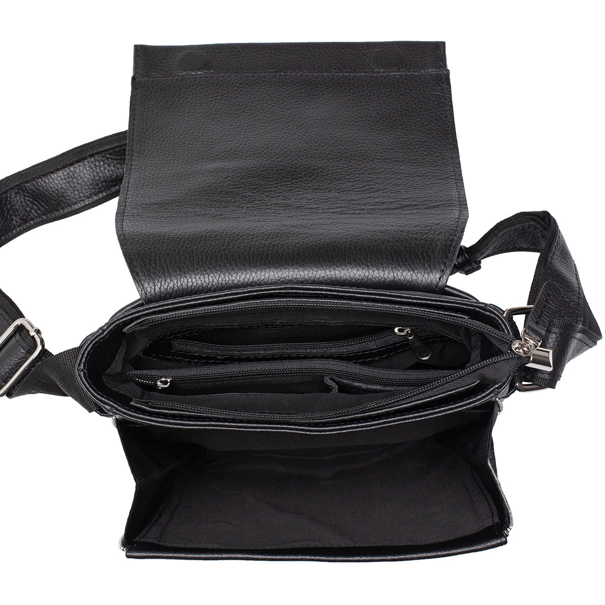 Мужская сумка через плечо Norton Black выполнена в классическом черном оттенке. Благодаря своему сдержанному дизайну аксессуар будет хорошо смотреться как с деловым костюмом, так и с удобной повседневной одеждой. Модель из натуральной кожи закрывается лаконичным прямоугольным клапаном. Под ним скрывается вместительный основной отсек, разделенный на два одинаковых по размеру отделения и широкий боковой карман с отдельной застежкой. Для мелких вещей, ключей или визиток предусмотрен маленький внутренний карманчик на молнии. Модель дополнена кожаным ремнем с массивной серебристой пряжкой.