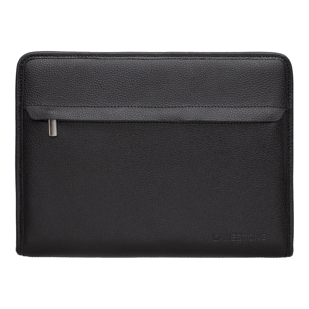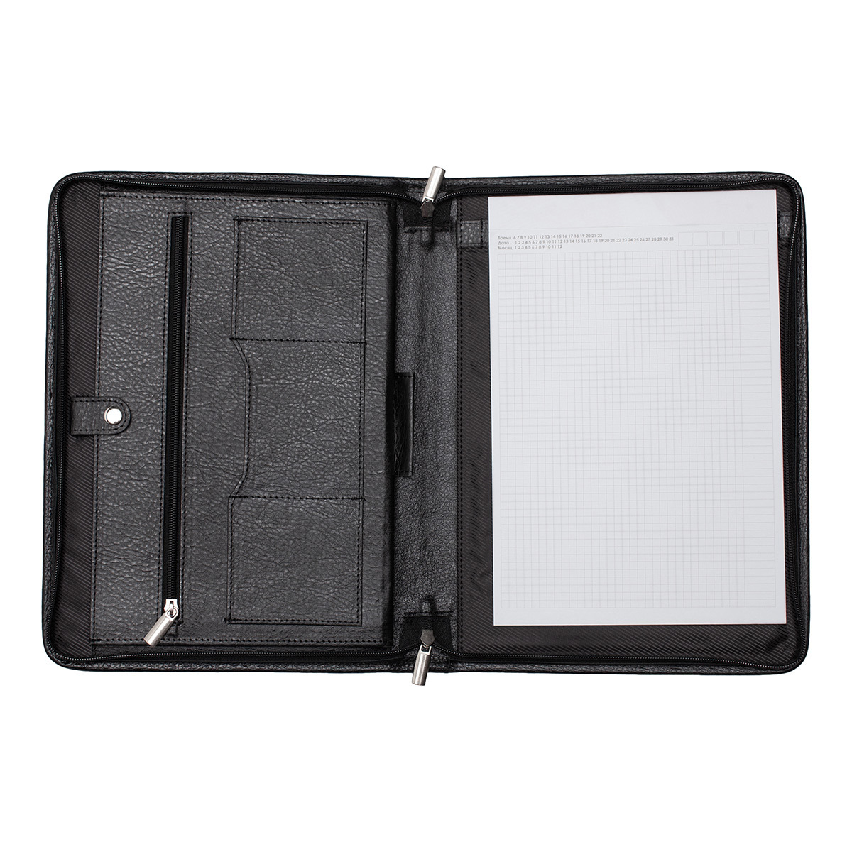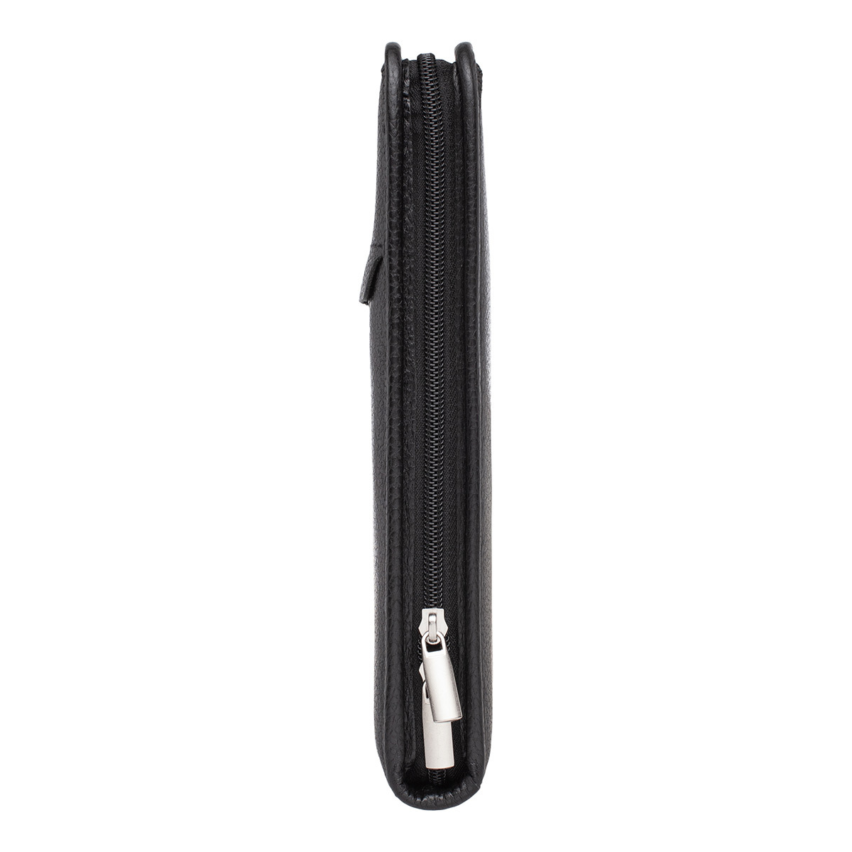 Компактность изделия дополнена лаконичной прямоугольной формой с закругленными углами. Оно удобно лежит в руке, не выскальзывает, не создает напряжения за счет минимального веса. Внешняя сторона дополнена вместительным карманом с горизонтальной молнией. Основное отделение застегивается на длинную змейку с двумя застежками эргономичной формы. Внутри можно расположить бумаги в двух карманах на кнопках. Также есть один кармашек на молнии и три – открытой модификации, для размещения канцелярии и визиток.